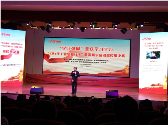 为学习贯彻习近平新时代中国特色社会主义思想,进一步激发高等教育系统党员群众学习热情,以学习实绩献礼新中国成立70周年,近期,由重庆市委教育工委、市教委主办,西南大学、重庆市高校网络思想政治工作中心承办的“学习强国”重庆学习平台“I学I行(爱学爱行)”风采展示活动在市内各高校启动。为此,学校积极谋划、精心准备,9月初即号召各学院党委(党总支)开展学习强国“用心学 ”大比拼活动。在各学院选拔出的优秀选手中,学校推荐通识学院的邹奇副书记参加决赛,并为较好开展知识竞赛活动的通识学院和邹奇录制了2个参赛视频报送市教委。参赛视频获得了市教委的好评,邹奇获得了决赛的参赛资格,代表学校参赛,并在10月10日的“学习强国”重庆学习平台“I学I行(爱学爱行)”风采展示活动高校组决赛中获得一等奖。