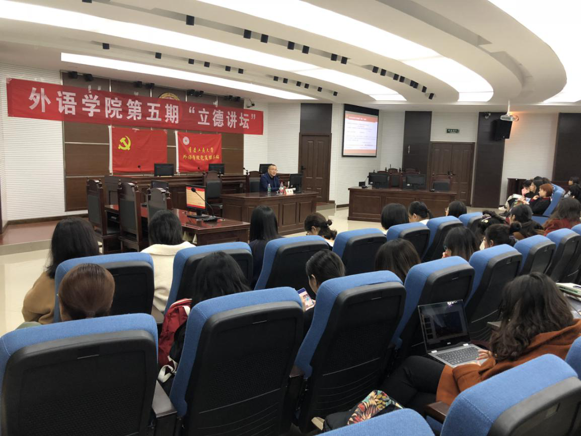 11月8日下午,由外语学院主办,党员服务站承办的“立德讲坛”(第五期):“青年的政治素养关乎党和国家前途命运”在南岸校区慧智楼426教室举行。本期讲坛邀请的嘉宾是我校马克思主义学院党总支书记陈松教授。外语学院全体学生党员和17级、18级入党积极分子参加了本次活动。外语学院党总支副书记程亚主持了本次活动。