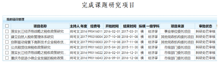 尚可文老师已经出版《财税改革前沿问题研究》、《政府、市场与财政》、《税收征管模式改革与创新》专著3部。先后主持完成国家税务总局税收科学研究所重点研究课题《落实长江经济带战略之税收政策研究》课题1项;重庆市财政局《公共租赁住房税收政策研究》课题1项;重庆市地方税务局《促进小微企业发展的税收政策研究》课题1项;完成重庆市南岸区地方税务局、渝中区地方税务局、巴南区地方税务局委托课题多项。并结合十八届三中全会精神和十九大报告的内容,将课题研究成果及时应用到课堂教学过程中,收到了良好的教学效果。