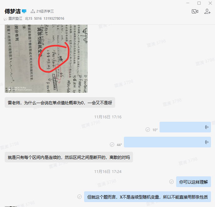 数学与统计学院雷澜老师每次课前至少提前10分钟开始直播,等候同学们陆续到来;在课前、课间关心学生的生活情况,询问学生的饮食和睡眠情况,鼓励大家坚持就是胜利;教学中更是细致,每讲到一处重点和难点,总是会停下来询问学生是否有听不懂的地方,结合同学们的反馈及时进行评讲。同时,通过企业微信,随时为同学们开展一对一答疑。